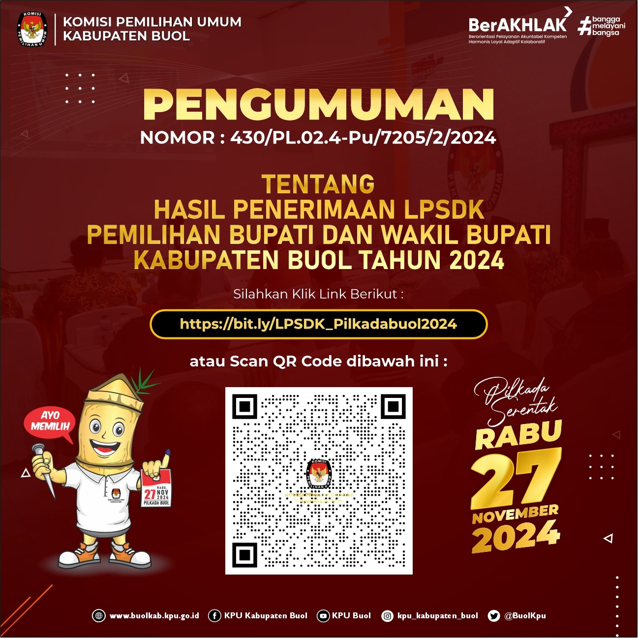 Menetapkan Hasil Pemilihan Bupati dan Wakil Bupati Kabupaten Buol Tahun 2024 dengan perolehan suara sebagai berikut KLIK DISINI