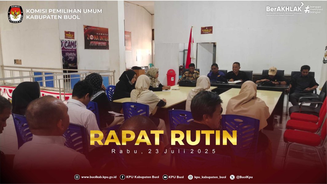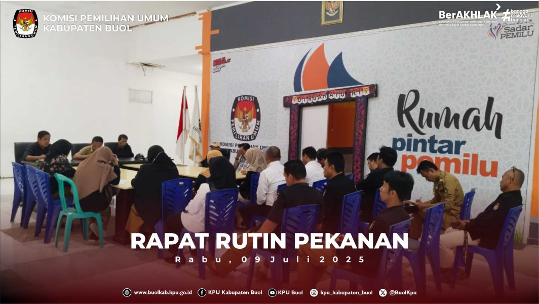 Buol kab-buol.kpu.go.id Komisi Pemilihan Umum (KPU) Kabupaten Buol kembali melaksanakan rapat rutin yang berlangsung di Ruang Media Center KPU Kabupaten Buol, Rabu (23/07/2025). Kegiatan ini diikuti oleh seluruh komisioner, serta jajaran staf sekretariat. Rapat dipimpin oleh Ketua KPU Kabupaten Buol, Nanang, S.E., dan membahas sejumlah agenda penting terkait penguatan koordinasi dan evaluasi internal. Fokus utama pembahasan kali ini adalah optimalisasi peran masing-masing bagian, evaluasi terhadap pelaksanaan tugas yang telah berjalan, serta kesiapan menghadapi pemeriksaan keuangan yang akan datang. Dalam arahannya, Nanang menekankan pentingnya sinergi antardivisi dalam menjalankan program kerja, serta perlunya menjaga akuntabilitas dan transparansi dalam setiap pelaporan keuangan dan kegiatan. Setiap subbagian diminta untuk menyampaikan laporan perkembangan kegiatan serta kendala yang dihadapi guna menjadi bahan evaluasi bersama. Selain itu, rapat juga menjadi momentum untuk memperkuat komunikasi antarunit kerja di lingkungan KPU Kabupaten Buol dan diharapkan seluruh jajaran semakin solid dan siap menjalankan tugas kelembagaan secara profesional, akuntabel, dan berintegritas.