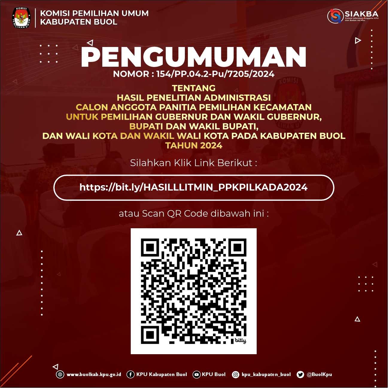 PENGUMUMAN PENDAFTARAN PASANGAN CALON BUPATI DAN WAKIL BUPATI BUOL TAHUN 2024 Sabtu, 24 Agustus 2024 00:00 392 Download Disini Baca Selengkapnya