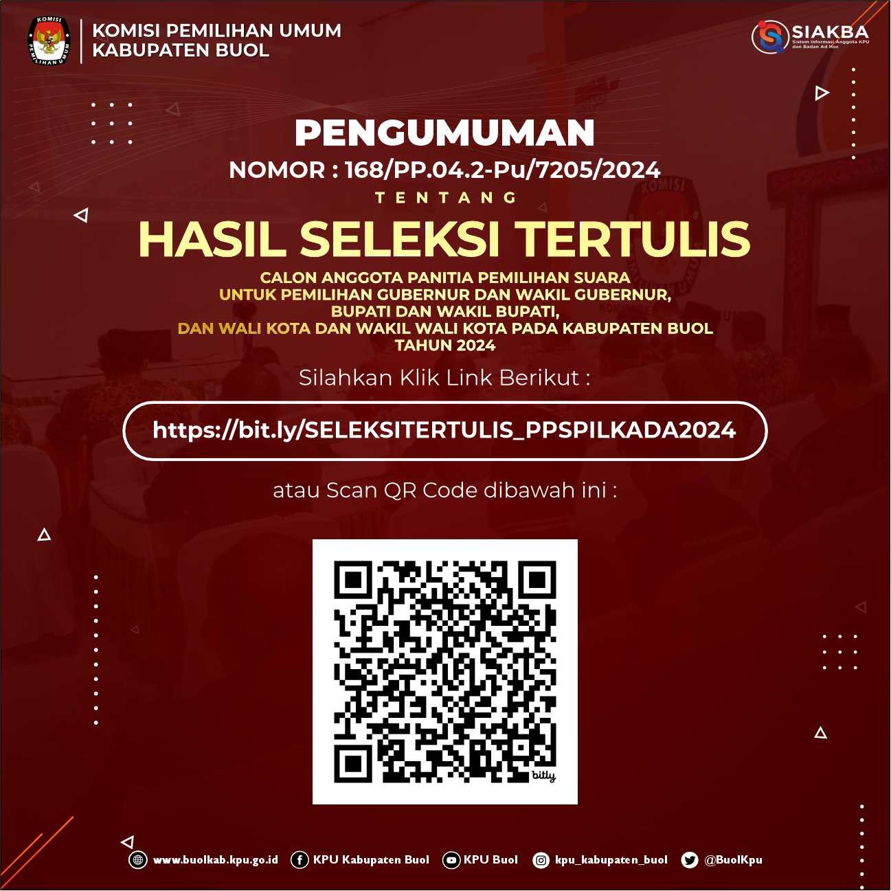 PENGUMUMAN HASIL SELEKSI TERTULIS CALON ANGGOTA PANITIA PEMUNGUTAN SUARA PILKADA 2024 Senin, 20 Mei 2024 00:00 441 Download Disini Baca Selengkapnya