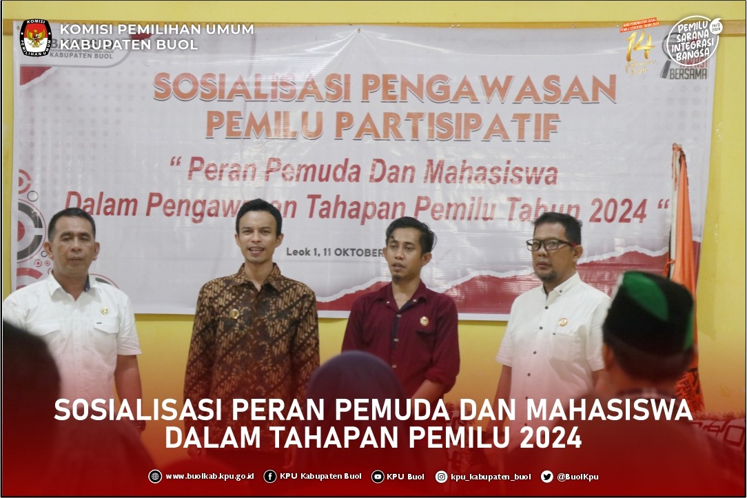 Buol kab-buol.kpu.go.id – Bertempat di gedung Graha Kurniawati Anggota Komisi Pemilihan Umum (KPU) Kabupaten Buol menghadiri kegiatan sosialisasi pengawasan partisipatif “Peran Pemuda dan Mahasiswa Dalam Pengawasan Tahapan Pemilu 2024” pada Rabu, 11/10/2023. Kegiatan yang dilaksanakan oleh Bawaslu Kabupaten Buol tersebut, menghadirkan organisasi kepemudaan dan perwakilan mahasiswa dari perguruan tinggi yang ada di Kabupaten Buol. Moh. Taufik Abdullah selaku anggota Bawaslu Kabupaten Buol memberikan apresiasi atas kehadiran seluruh undangan dan peserta, dalam mensukseskan kegiatan tersebut. Sementara itu, anggota KPU Kabupaten Buol divisi sosialisasi pendidikan pemilih, partsisipasi masyarakat dan SDM Faisal J. Usman yang hadir sebagai narasumber menyampaikan bahwa, peran pemuda dan mahasiswa sangat penting dalam pelaksanaan tahapan Pemilu 2024. Faisal mengatakan Dalam Pemilu 2024 pemuda memiliki peran strategis dengan menjual ide/gagasan kepada pemangku kepentingan, bekerja sama dengan penyelenggara Pemilu,dan ikut mengawasi dan menjadi bagian partai/peserta Pemilu untuk mewujudkan Pemilu yang berkualitas “Saya berharap,kepada para pemuda dan mahasiswa, mari kita sukseskan Pemilu 2024 dengan ikut mengawal tahapan dan juga menyiapkan peran kita dalam menghadapi eskalasi politik” Faisal juga menambahkan generasi milenial berpikiran terbuka dan melek politik, diharapkan mampu menyebarkan dan menjaga nilai-nilai toleransi atas persaingan politik, sehingga Pemilu 2024 dimaknai sebagai sarana integrasi bangsa. generasi milenial memiliki karakter melek teknologi, diharapkan dapat menjadi aktor dalam memfilter berita hoaks maupun ujaran kebencian kepada masyarakat. Selain itu generasi milenial mampu mendapatkan dan mengolah sumber informasi dengan cepat dan akurat, mampu memberikan kritik objektif kepada pemerintah. (humas kpubuol fm/foto fm/ed sy)