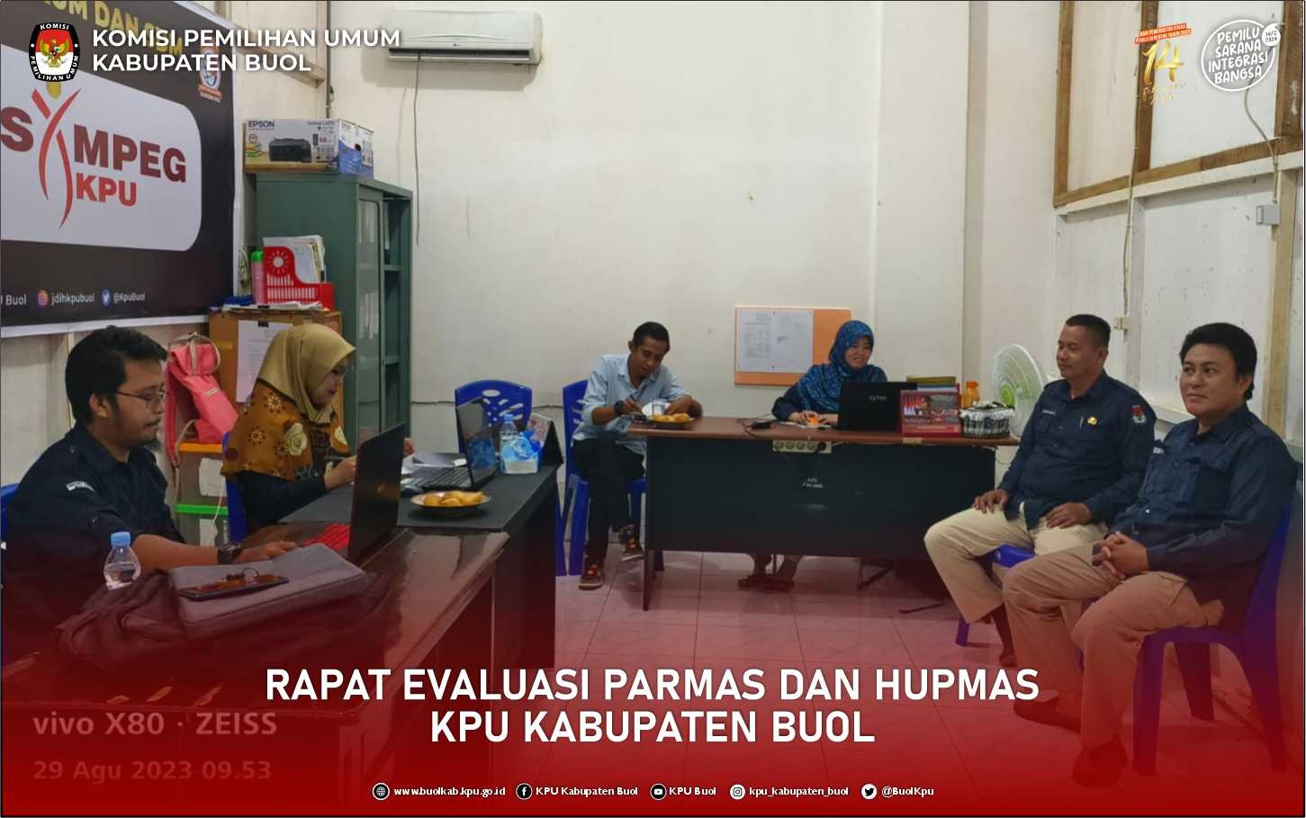 Buol - Komisi Pemilihan Umum kabupaten Buol melaksanakan evaluasi pada bagian sosdiklih, parmas dan hupmas, Selasa 29/08/2023, di kantor KPU kabupaten Buol, Jl. Syarif Mansyur kelurahan Leok I, kecamatan Biau. Anggota KPU kabupaten Buol Faisal J. Usman menyampaikan, bahwa pentingya divisi Sosialisasi, pendidikan pemilih, partisipasi masyarakat, untuk menjalankan tugas sebagai corong informasi lembaga pemerintah. “sebagai corong informasi, KPU kabupaten Buol harus bisa meningkatkan partisipasi masyarakat pada pemilu 2024 nanti. Tentu semua bergantung pada strategi kita dalam melakukan sosialisasi” pungkas Faisal Kepala sub bagian teknis, parmas dan hupmas KPU kabupaten Buol Sapriyanti juga menuturkan, evaluasi ini dimaksudkan untuk meningkatkan kualitas penyebaran informasi dan juga mencegah berita hoax. “sosialisasi dan seluruh penyebarluasan informasi harus kita kendalikan dengan baik, dan sedini mungkin kita bisa mencegah adanya berita-berita hoax pemilu” imbuhnya. Kegiatan diikuti oleh seluruh staf bagian teknis parmas dan hupmas KPU kabupaten Buol. FM-Humas KPU Kabupaten Buol