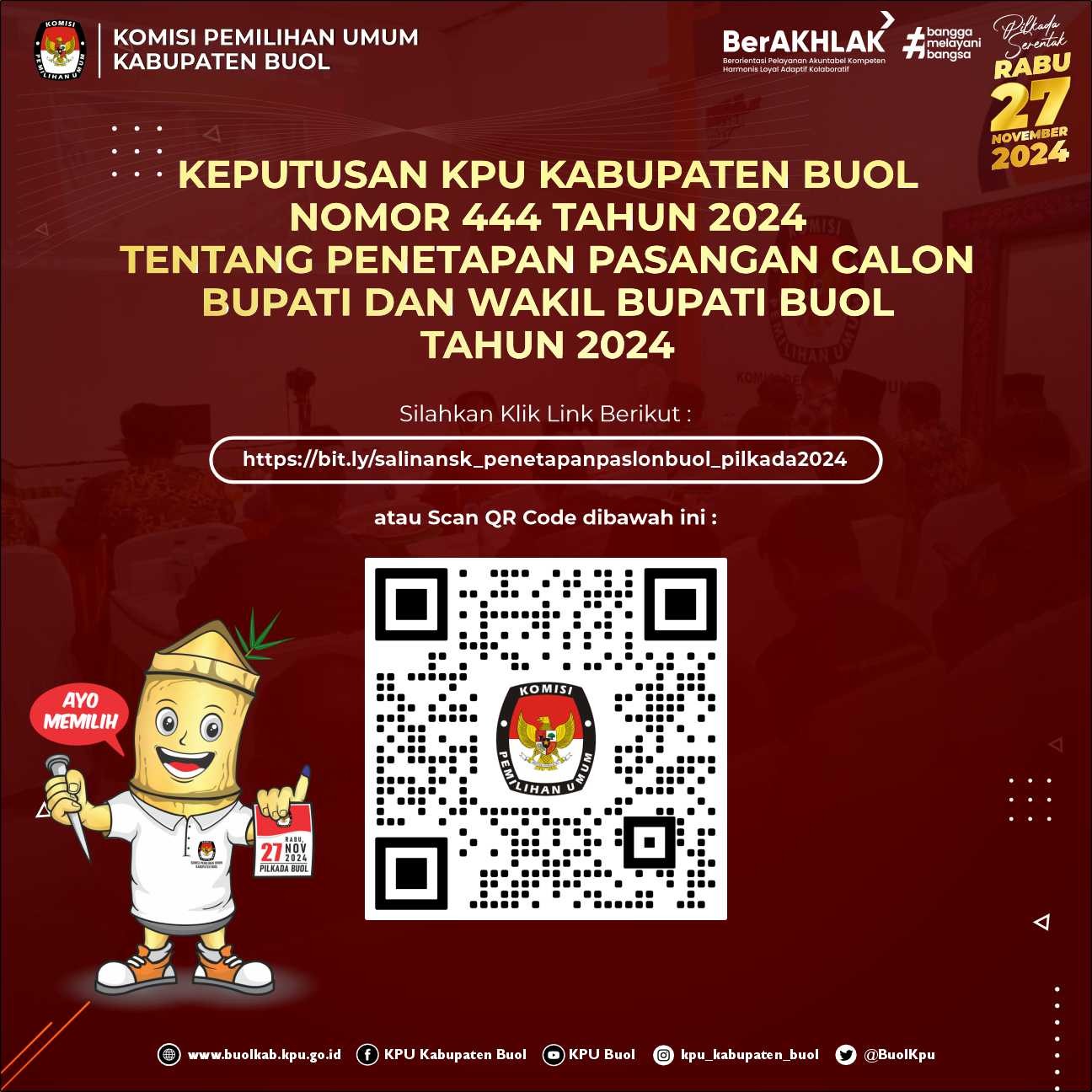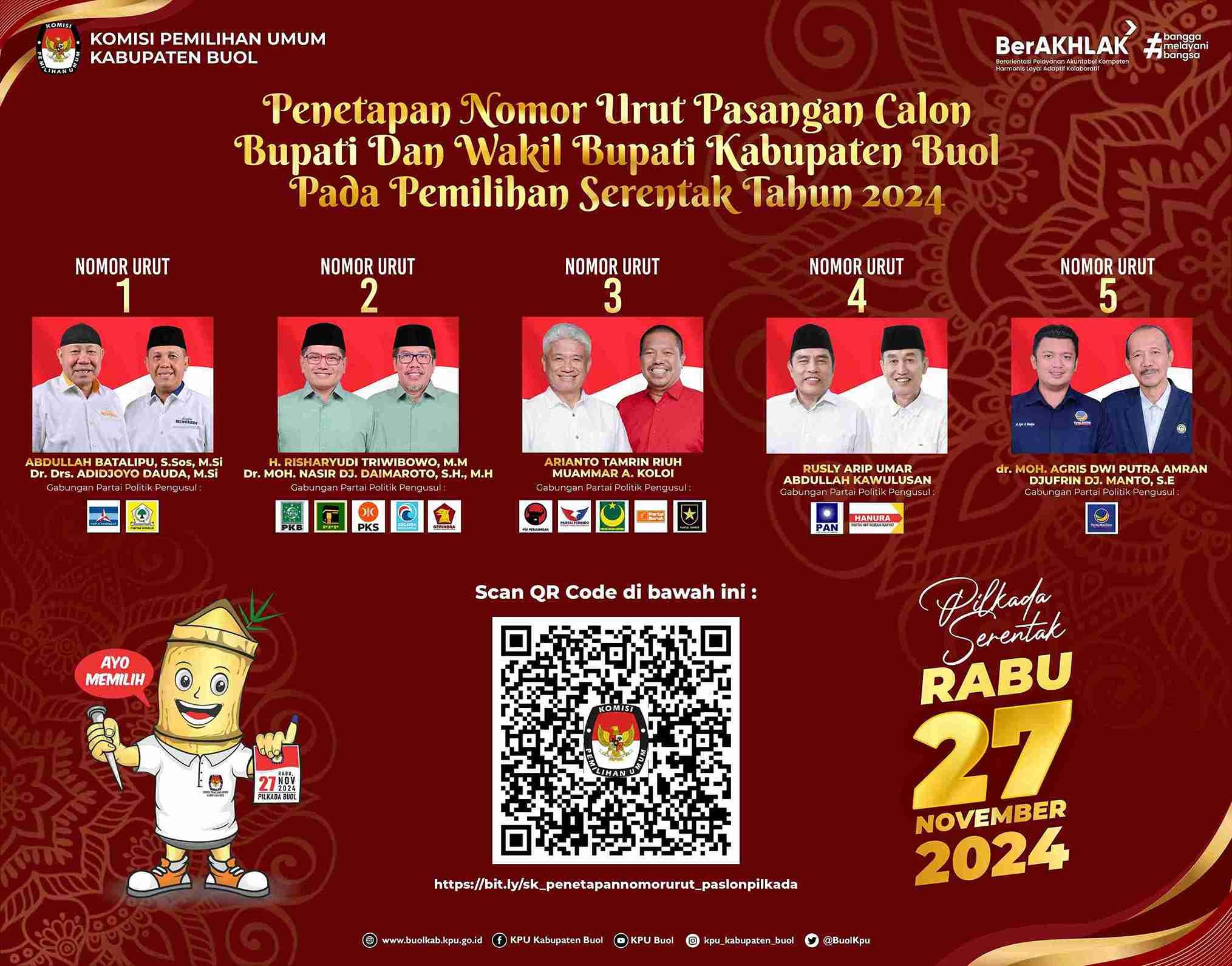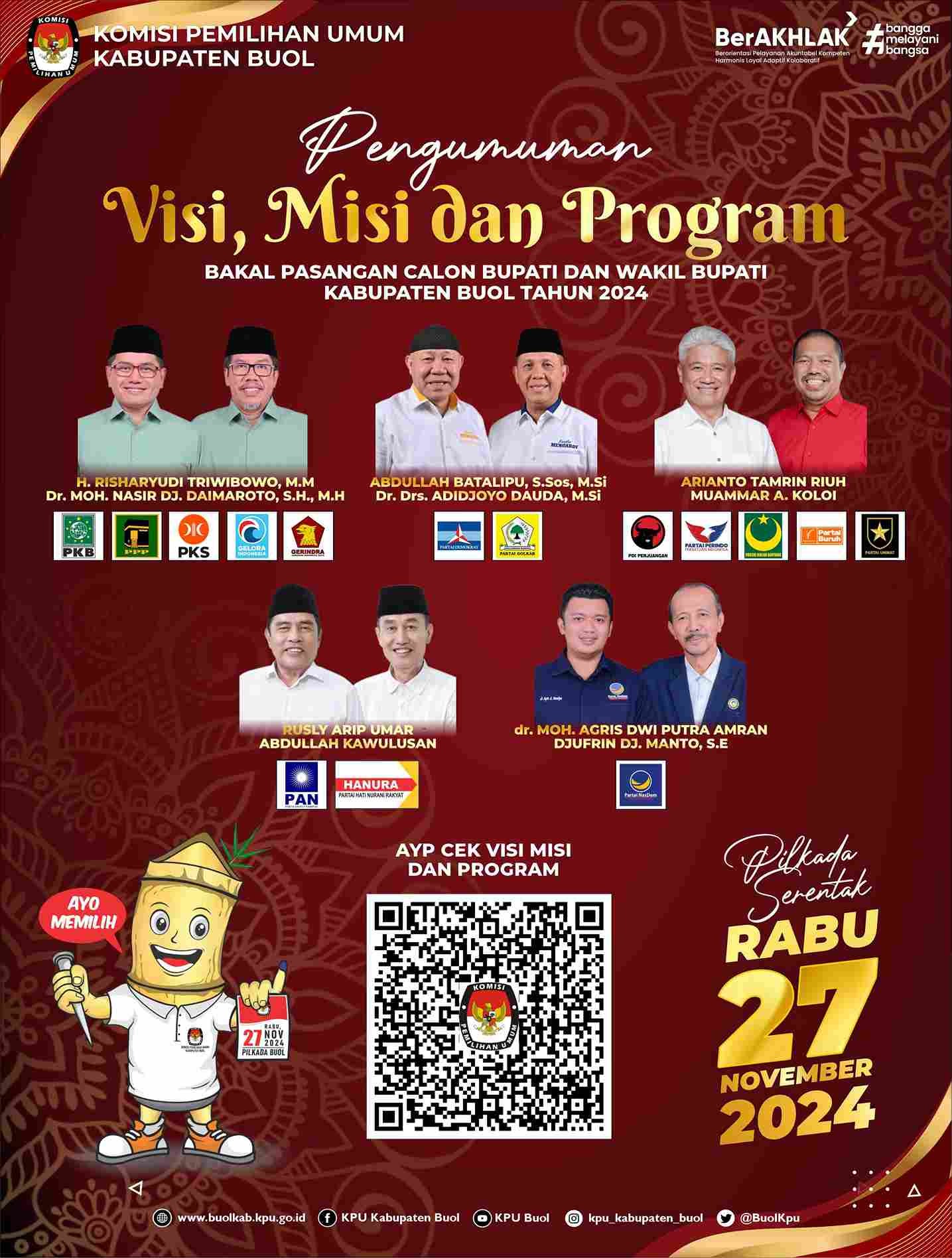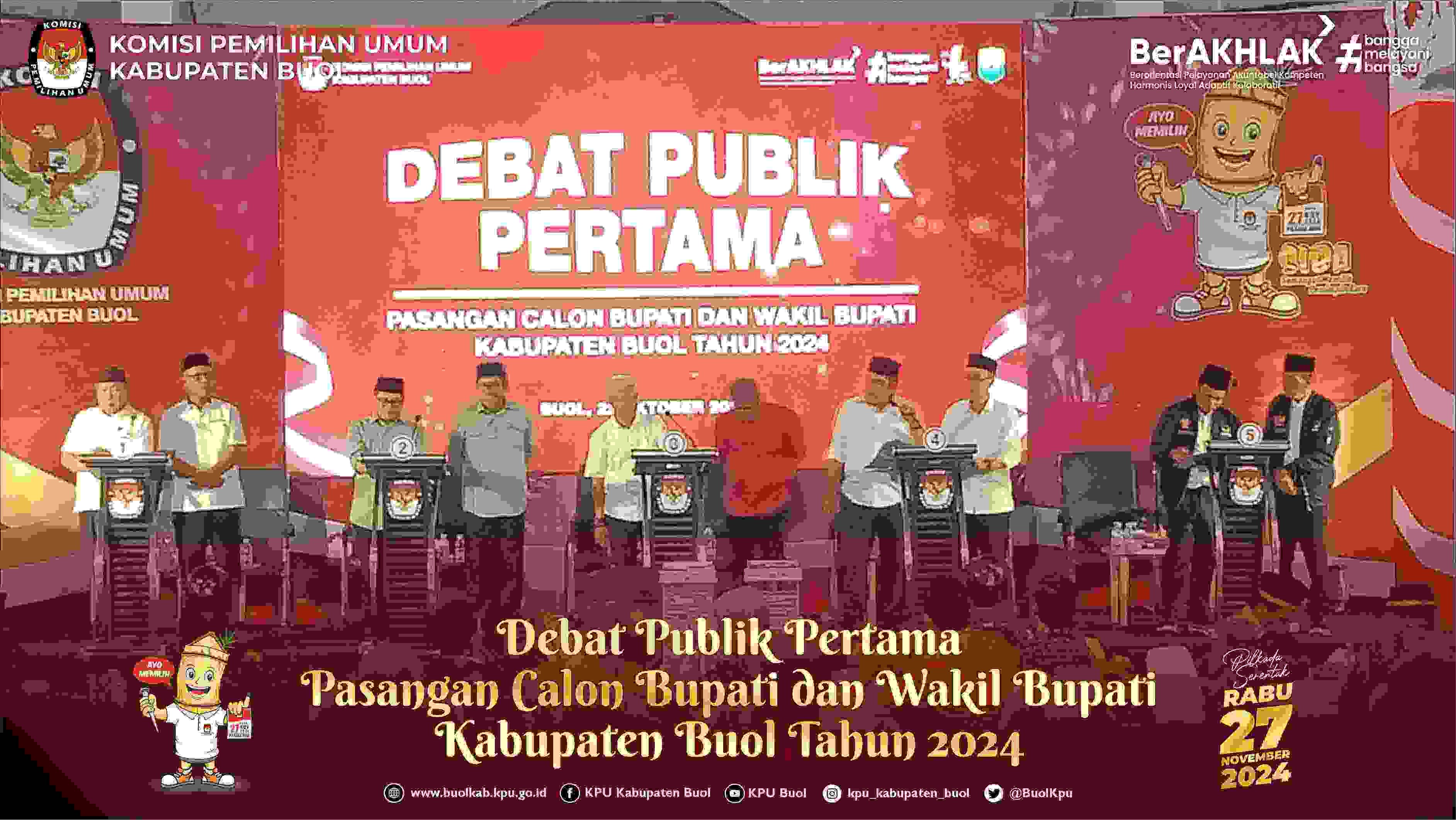 Buol kab-buol.kpu.go.id – Komisi Pemilihan Umum (KPU) Kabupaten Buol melaksanakan Debat Publik Pertama Pasangan Calon Bupati dan Wakil Bupati Buol Tahun 2024, dengan tema ”Transformasi Ekonomi, Sosial dan Budaya melalui Pembangunan Infrastruktur yang merata untuk kemajuan daerah”. Selasa, 22 Oktober 2024, di Aula Kantor KPU Kabupaten Buol Jl. Syarif Mansyur Kelurahan Leok I. Dalam sambutannya, Ketua KPU Kabupaten Buol, Nanang menyampaikan bahwa, kegiatan Debat Publik merupakan metode untuk menyampaikan visi misi pasangan calon kepada masyarakat, utamanya bagi mereka yang telah mempunyai hak pilih pada Tanggal 27 November nanti. ”Kegiatan Debat Publik ini, kami harapkan mampu menyampaikan kepada masyarakat Kabupaten Buol tentang visi misi pasangan calon Bupati dan Wakil Bupati Kabupaten Buol Tahun 2024”. Pungkas Nanang. Selama debat berlangsung, setiap pasangan calon menyampaikan jawaban atas pertanyaan yang diajukan, serta memberikan sanggahan terhadap pernyataan calon lainnya. Acara ini diakhiri dengan kata penutup (closing Statement) dari setiap pasangan calon, diikuti dengan sesi foto bersama sebagai penutup. Debat Publik sebagaimana diatur dalam Peraturan Komisi Pemilihan Umum Nomor 13 Tahun 2024, tentang Kampanye Pemilihan Gubernur Dan Wakil Gubernur, Bupati Dan Wakil Bupati, Serta Walikota Dan Wakil Walikota merupakan Metode Kampanye yang difasilitasi oleh KPU Provinsi dan KPU Kabupaten/Kota, bertujuan untuk mengetahui visi misi pasangan calon pada Pemilihan Bupati dan Wakil Bupati Buol Tahun 2024. (humas kpubuol fm/foto eo/ed hr)