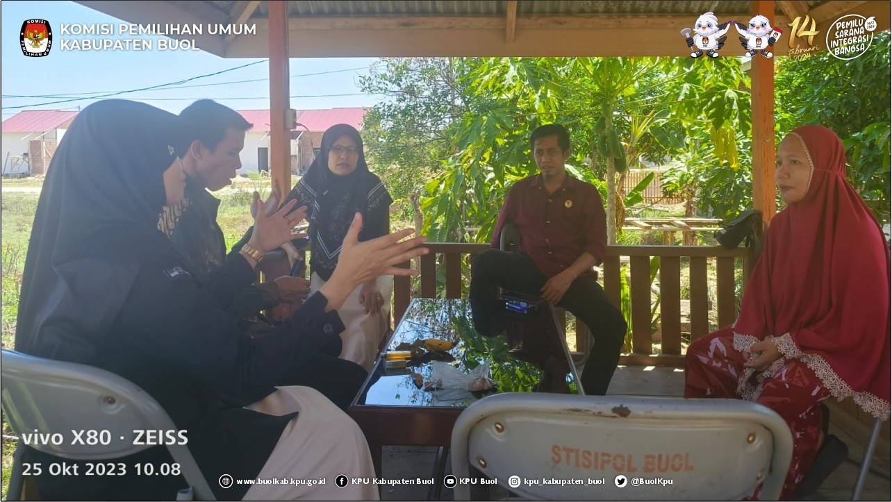 Buol kab-buol.kpu.go.id – Komisi Pemilihan Umum (KPU) Kabupaten Buol melaksanakan silaturahmi kepada Dosen STISIPOL Buol Sri Yanti Um. Armen di kediamannya pada Rabu, 25/10/2023 Kunjungan tersebut dilaksanakan untuk persiapan kegiatan KPU Goes To Campus, sebagaimana Instruksi KPU RI dalam suratnya nomor 1015/PP.06-SD/09/2023 untuk melaksanakan kegiatan tersebut dalam rangka memperingati hari sumpah pemuda ke 95 dengan tema nonton barena (NoBar) Film Pemilu “Kejarlah Janji”. Sri Yanti mengatakan siap berkolaborasi untuk mensukseskan kegiatan tersebut, yang akan dilaksanakan pada tanggal 28 Oktober 2023 nanti. Sementara itu anggota KPU Kabupaten Buol divisi sosialisasi pendidikan pemilih, partisipasi masyarakat dan SDM menyampaikan bahwa, pelaksanaan kegiatan KPU Goes To Campus akan dimeriahkan dengan penampilan vokal grup dari STISIPOL Buol, dan juga bagi-bagi doorprize. Dalam kunjungan tersebut turut serta, Kasubag dan Staf Teknis KPU Kabupaten Buol untuk memberikan gambaran dan informasi tentang rancangan pelaknsanaan kegiatan Nobar Film Kejarlah Janji. Kegiatan KPU Goes To Campus direncanakan akan dilaksanakan di Basement kantor KPU Kabupaten Buol Jl. Syarif Mansyur Kelurahan Leok I.(humas kpubuol fm/foto rm/ed sy)